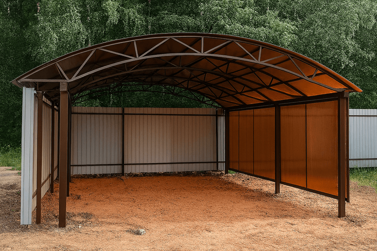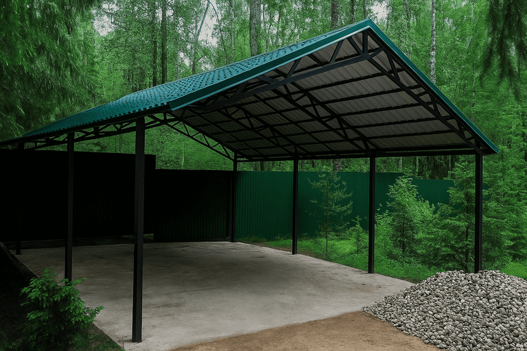 Навес для автомобиля из металлопрофиля защищает транспорт от осадков, солнца и пыли. Конструкция устойчива к ветровым и снеговым нагрузкам и подходит для круглогодичного использования.
